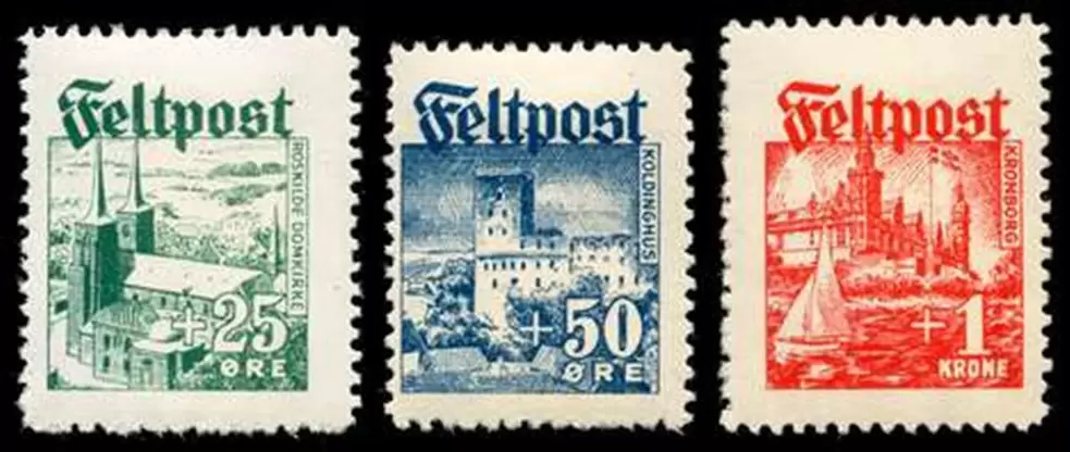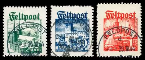 Danish Legion Feltpost Stamps: 1944 Famous Landmarks Views. Complete perforated set of three: Green +25 øre Roskilde Domkirke (cathedral), Blue +50 øre Koldingshus (Kolding Castle), and red +1 mk Kronborg castle (which also served as a lighthouse). The plate positions of these particular examples are respectively 3, 3, 2 (per Brunel). These fundraising stamps were issued in Denmark by Nazi German authorities and were intended to act like semi-postal stamps (to benefit Danish Legion soldiers fighting on behalf of the Germans on the Eastern Front) on free military mail; thus there was no base denomination, only the supplementary value. Only known issued in a booklet (extremely rare) with all the stamps perforated on all four sides. Forgeries exist; modern reproductions are plentiful. THESE ARE GENUINE STAMPS WITH FAKE CANCELLATIONS ADDED. “Canceled” with “FELDPOST / d / 20.10.44” FAKE “postmarks”. (In an attempt to create used examples, which would be much more valuable than mint hinged examples, the faker greatly reduced the value of these otherwise genuine stamps.) The centering of these stamps is all VF or better. Typical somewhat rough perforations (not all fully cleaned out). These were examined in July 2018 by the German verbandsprüfer Robert Brunel, a well-qualified expert in this field. He did not issue a certificate for them because the cancellations are fake — apparently that is either his policy or the policy of the accrediting prüfer organization. He declared that the stamps were genuine and without faults, but that the cancellations are fake. This extremely scarce set is little-known to most collectors of Danish stamps and even of WWII stamps in general unless one has thoroughly read the Michel Catalog. (It is my policy not to permanently mark such items as fakes because there have been rare instances when fake-marked items have actually later been determined to be genuine. I have marked these lightly in pencil on the reverse with “fake cancel”.) Since the underlying stamps are genuine, this is a reasonable opportunity to own the stamps at a exceptionally low price; even if unused without gum, this set would sell for around $450!