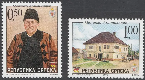 The stamps were part of a series dedicated to Art – Paintings by Milenko Atanacković and were issued around February 7, 2005. Milenko Atanacković (1875-1947) was a Serbian painter known for his detailed works, often depicting figures and scenes from his time and region, particularly Bijeljina and Semberija.